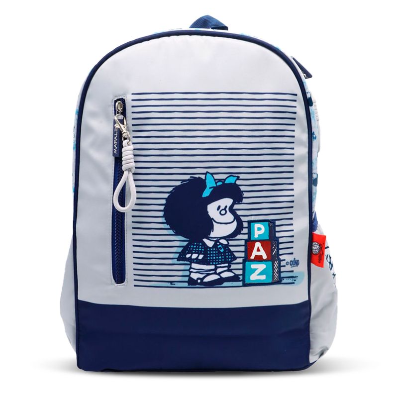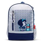Hermoso combo escolar inspirado en Mafalda, un diseño clásico que transmite ternura además de estilo. Ideal para niñas que buscan un look diferente para el colegio. Incluye mochila, lonchera además de cartuchera, todos con acabado en tono gris azul combinado con detalles en celeste que resaltan el personaje. Material textil resistente, costuras reforzadas, cierres firmes que garantizan durabilidad durante todo el año escolar. Una opción práctica, funcional además de muy atractiva para el regreso a clases.