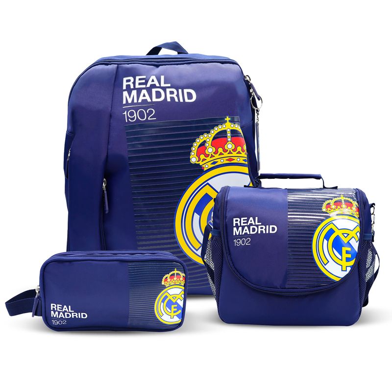 Combo escolar del Real Madrid CF en color azul con diseño oficial y moderno, ideal para estudiantes fanáticos del club. Incluye mochila, lonchera y cartuchera a juego, elaborados con material resistente y de fácil limpieza para el uso diario. La mochila ofrece un compartimento principal amplio para cuadernos y útiles, además de bolsillo adicional con cierre y asas acolchadas que brindan mayor comodidad al transportarla. La lonchera permite llevar los alimentos de forma ordenada y segura, perfecta para el recreo. La cartuchera complementa el set con espacio ideal para lápices, lapiceros y colores. Un combo práctico, funcional y con estilo deportivo.