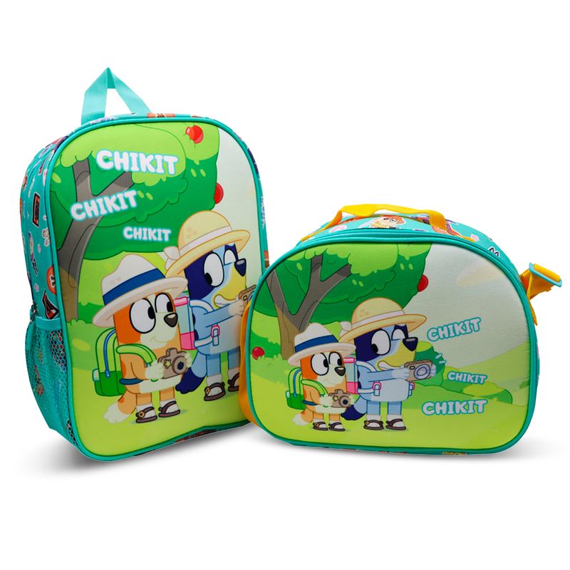 El combo escolar de nido de Bluey incluye mochila de espalda y lonchera a juego en color celeste con una ilustración divertida de los personajes en un paseo al aire libre. La mochila ofrece compartimiento principal amplio, cierres resistentes, asas acolchadas que brindan comodidad para el uso diario en los más pequeños. La lonchera permite llevar los alimentos de forma ordenada, estructura firme, asa superior que facilita el transporte. Elaborado en material textil ligero, resistente, tamaño Premium Nido ideal para clases iniciales, paseos escolares, actividades del día a día.